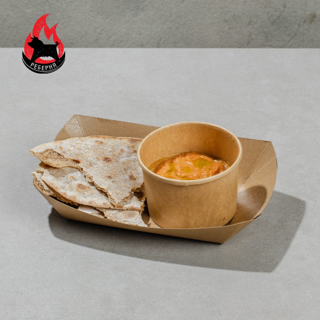 Хумус на основі з нуту з додаванням пасти мухамара, що готується з печених перців, горіхів та спецій. Подається з цільнозерновою паляничкою.