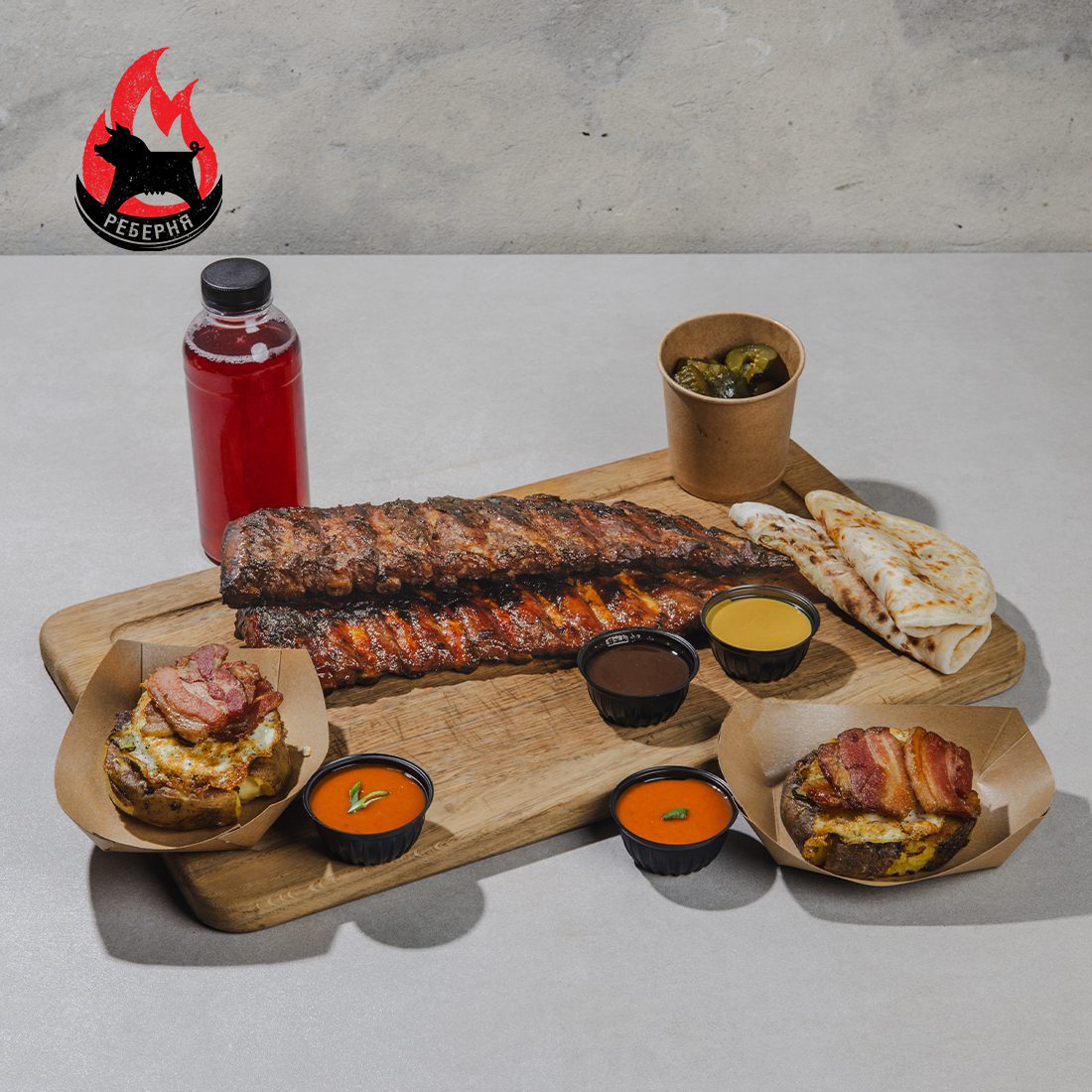– 2 порції Ребер на вогні  + 2 соуси (барбекю та гірчичний)