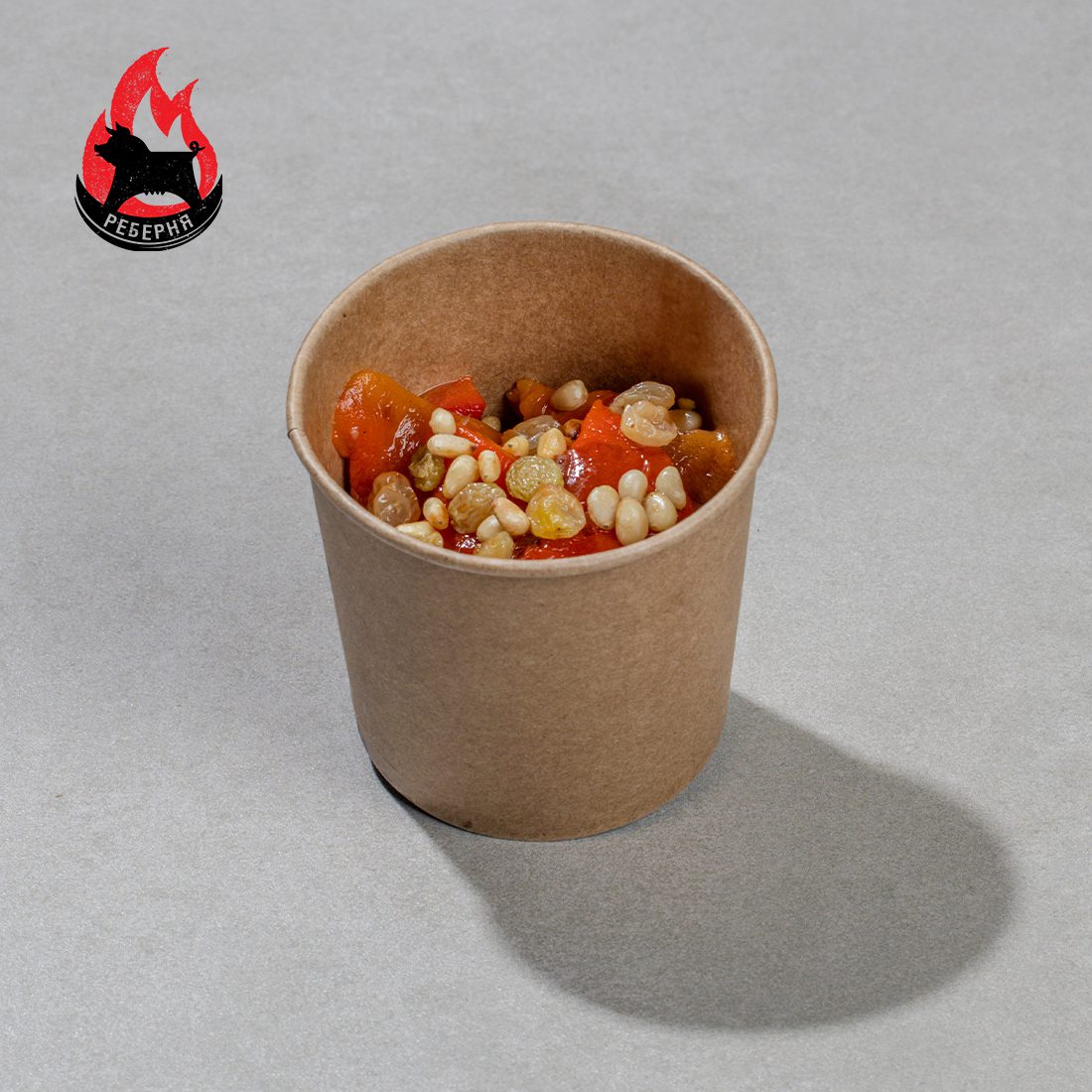 Салат з печених кольорових перців заправлених часниковою олією, з додаванням подріблених горіхів та родзинок.