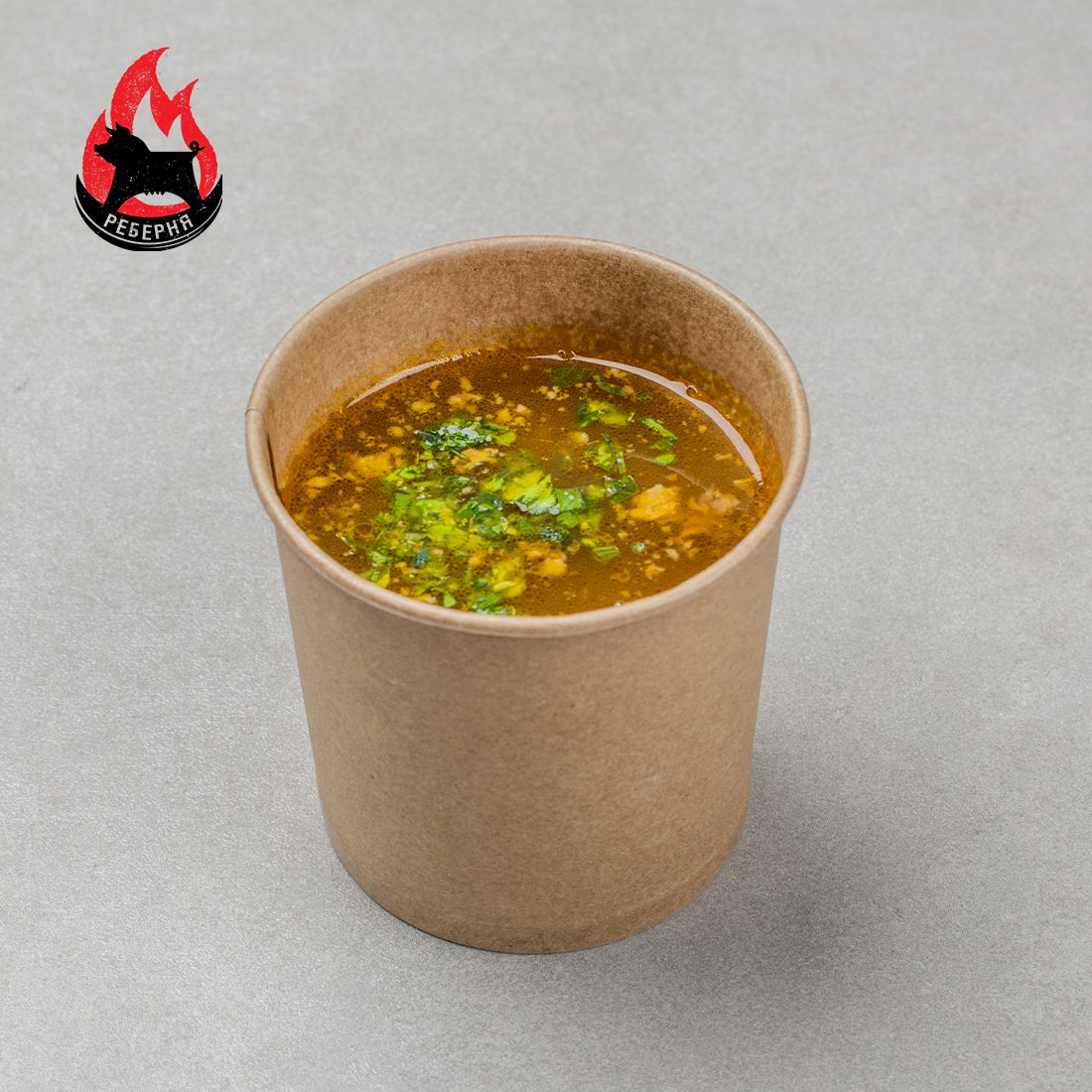 М’ясна зупа на основі свиного гуляша, кореня селери, ріпчастої цибулі, моркви, овочевого бульйону, петрушки та перцю чілі.
